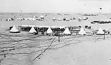 Murray considered it very unlikely that an attack would occur anywhere other than in the northern sector and therefore was prepared to reduce the troops in Nos 1 and 2 Sectors to a minimum.[36] He decided not to reinforce his four infantry brigades, but to increase the available fire-power at Romani by moving up the 160th and 161st Machine Gun Companies of the 53rd (Welsh) and the 54th (East Anglian) Divisions.[36][37] He also ordered the concentration of a small mobile column made up of the 11th Light Horse, the City of London Yeomanry (less one squadron each) with the 4th, 6th and 9th Companies of the Imperial Camel Brigade in No. 2 Sector. He calculated that the whole of the defensive force, including the camel transport necessary to enable infantry in the 42nd (East Lancashire) Division to advance into the desert, would be fully equipped and the camels assembled by 3 August.[36] Approximately 10,000 Egyptian Camel Transport Corps camels concentrated at Romani prior to the battle.[38][39][Note 2] British monitors in the Mediterranean Sea off Mahamdiyah got into position to shell the assembling Ottoman force, while an armoured train at Kantara was ready to assist the defence of the right flank, and all available aircraft were on standby at Ismailia, Kantara, Port Said and Romani.[40]