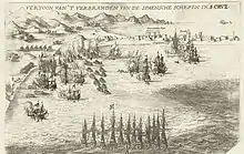 2 galleons,[lower-alpha 1] 9 merchant ships,[lower-alpha 2] 5 other vessels, 1 castle and various shore gun emplacements | 23 warships[5] | ||||||