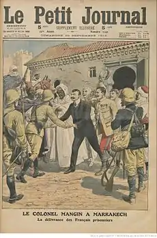 Mangin arrived with the rest of the army that afternoon, and set up his camp at Gueliz, northwest of the city, where he received the Marrakeshi qaids and their oaths of allegiance to the sultan Yusuf.[37] Two days later, on 9 September 1912, the French army finally entered and took possession of the city of Marrakesh.[38]