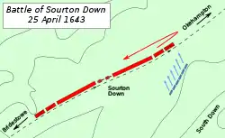On reaching Okehampton, some of Chudleigh's units departed, leaving him 1,000 infantry, and three or four troops of dragoons.[12] This was interpreted as a general retreat; Hopton later recorded "there came a friend from Okehampton, who assured us the enemy was in very great disquiet and fear."[13] Hoping to take advantage, he left Launceston with 3,000 infantry, 300 cavalry and 300 dragoons. The column was led by 300 dragoons and cavalry, then half the infantry, with their four guns in the centre. The rest of the infantry followed, with the remaining dragoons and cavalry in the rear.[13][14] They intended to stop for the night at Sourton Down, then attack Okehampton at dawn.[15]
