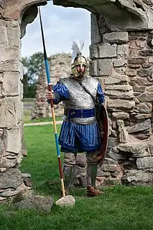 At this time of Strasbourg, the Alamanni confederation appears to have been under the presidency of two paramount kings, Chnodomar and Westralp.[16] Chnodomar was the driving force. A man of prodigious stature, strength and energy, he was nicknamed Gigas ("the Giant") by the Romans.[17] He was a formidable sight in his "flashing" helmet (probably gold-leafed) and full parade armour. He is described by Ammianus as the "evil mastermind" behind the invasion of Gaul.[18] Under the paramount king were 7 other kings (reges). It is possible that the petty kings (reguli) mentioned by Ammianus were the rulers of the pagi. Underneath the regal class were the nobles (called optimates by the Romans) and warriors (armati). The warriors consisted of professional warbands and levies of free men.[19] Each nobleman could raise an average of about 50 warriors.[20]