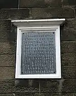 A commemorative plaque on Needless Road in Perth. It reads: "A tombstone which stood at one time in the field to the north of Needless Road marked the spot where many covenanters from Fife were slain in flight after the Battle of Tibbermuir on 1st September 1644"