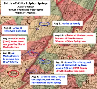 Averell's brigade moved north to Big Spring in Pocahontas County, and continued north at 2:00 am on August 30.[102] They cut through a blockade on August 30, and arrived at Beverly on August 31.[108] Averell's report devoted about half of a page to a retreat that lasted between three and four days, suggesting his retreat was orderly and deliberate.[102] However, abandoning wounded, night marches, road blockades, and fires left burning to deceive the enemy, are signs of concern about the safety of the brigade.[109] A soldier from the 2nd West Virginia Infantry described the retreat as "a hard, trying march, and we were mercilessly bushwhacked".[108]