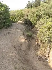 The Ottoman front line at the Nek consisted of two lines of trenches, with machine guns positioned on the flanks on spur lines, which provided clear fields of fire into no man's land in front of the Ottoman position.[16] Behind this another eight trenches existed, tiered along the slopes towards Baby 700. At least five groups of machine guns – approximately 30 altogether – were located in the area, providing direct fire support to the Ottoman troops holding the Nek.[17][18] These positions were widely dispersed and positioned in depth, at least 200 yards (180 m) from the Ottoman front line.[19] The commanders of the two Ottoman regiments occupying positions around the Nek had chosen not to cover their trenches, despite orders from their divisional headquarters, due to concerns that a bombardment would collapse the roofs and block communication through the trenches, similar to what had occurred at Lone Pine.[20]