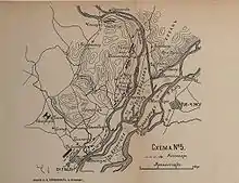 By 21 April 1904 the Japanese 1st Army was concentrated and hidden south of Wiju. The Japanese were in the same positions on the southern bank of the Yalu River that they had been in August 1894. The Japanese knew the exact locations of the Russians' deployment from intelligence by forward scouts disguised as Korean fishermen, the Russians made no effort to conceal their positions.[3] By 23 April, the Japanese knew the layout of the Russian trench line and details of the defensive positions around the area of Antung.[3] Intelligence was so effective that the Japanese estimate of the Russian troop strength was only exceeded by 1000 and the estimate of the guns which was only two less than the actual number.[3] The Japanese made every effort to keep their positions hidden. Screens of trees, millet and bushes were used to conceal activity as well as roads, artillery and other equipment.[3]