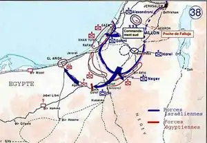 The main thrust of Operation Horev was in the south, and on December 25–27, Israeli forces captured the Beersheba'Auja road, including Bir 'Asluj.[2] The Southern Command decided to exploit this success in order to complete the rest of Operation Horev, namely, to surround and eventually expel all Egyptian forces from Palestine. The order was given to move into the Sinai Peninsula on the morning of December 28.[2] This order directly contradicted the General Staff plan, which forbade entering Egyptian territory.[4] According to Yitzhak Rabin, then the operations officer of the Southern Command, the command attempted to create facts on the ground before getting the necessary approval for the action.[5]