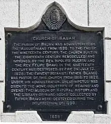 The Augustinian Chapter founded Bauan as a visita of Taal, on May 17, 1590. Fr. Diego de Avila,[1] was appointed as the priest in charge of Bauan. On May 12, 1596, Fr. Idelfonso Bernal was appointed prior. In 1660, the town was annexed to Taal because of its insufficient number of "tributos". From its original site in the shores of Bombon river, Fr. Jose Rodriguez relocated the town to a place called Durugto in 1662. Later, Fr. Nicolas Rivera again relocated the town to a place known as Lonal. Fr. Rivera built a church, convent, schools, and a fort, all of strong materials.[1] Finally on 1692, Fr. Simon Martinez, relocated the town in its present site.