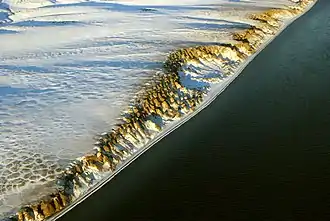 Baydzharakh formations are found in different places across the East Siberian Lowland, such as Muostakh Island, Stolbovoy Island, Kotelny Island and the Ulakhan-Sis Range, as well as in scattered places of the Yana-Indigirka Lowland.[5] In 1950 a baydzharakh was the last vestige of now disappeared Semyonovsky Island in the Laptev Sea. They often occur together with Yedoma (Едома) complexes and in areas with ice-wedges of considerable thickness.[6]