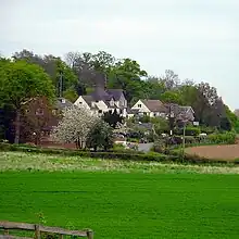 The village lies just three miles south of Shrewsbury, and is separated from the county town by the main A5 Trunk road. It has good road transport links, with easy access to both the A49 and A5. To the south lies the pre-Cambrian Lyth Hill, with Sharpstone Hill standing to the east, the latter now mostly a major sandstone quarry with little of the hill itself now remaining after several hundred years of constant quarrying activities.[10]