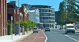 The harbour section of the street is lined with heritage buildings, such Dalgety Woolstores,[3] Australia Hotel, and other shipping and export related industries,[4] as well as former businesses existing in the street, such as Western Ice Works,[5] and Western Engineering and Foundry Company.[6] Due to its location, it was possible to see the development of the portion of Eastern Fremantle (formerly known as Richmond), from Beach Street over time.[7][8]