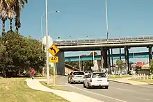 It crosses under the Fremantle Traffic Bridge and turns uphill next to the Fremantle Railway Bridge.