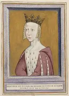 Beatrice of Bourbon (1320 – 23 December 1383) was a French noblewoman. A member of the House of Bourbon, she was by marriage Queen of Bohemia and Countess of Luxembourg.