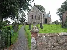 The building is constructed from squared and coursed sandstone from the nearby wall, the line of which runs directly beneath the church, with a graduated roof made from greenslate, coped gables and a cross finial. Little remains of the original church although the single chamber interior is still mostly of the earlier period, notably the south doorway and three east windows, but the church underwent restorations in 1784, 1872 and 1888.[9] The single chamber is still mostly of the earlier period, notably the south doorway and three east windows. The windows, porch and vestry are 19th century restorations and the king post open timber roof dates from the 15th century. Hadrian's Wall Path passes the church, on its way from Carlisle to Bowness-on-Solway (via Grinsdale and Burgh-by-Sands).[10] The church became a Grade II listed building on 1 May 1957.[9]