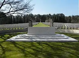 The large Cross of Sacrifice with its crusader sword and the altar stone are aligned on the same axis and linked by a wide swathe of grass. The altar stone, with the inscription "Their Name Liveth For Evermore", was built on circular bed created especially for it. On both sides of the St. Patrick's cross there are two low buildings; one houses the register of graves and is open to the public.