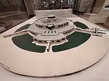 Gatwick Airport, as it had become, was requisitioned for military use during the Second World War. Afterwards, it was eventually agreed upon as the site of London's official second airport, behind Heathrow, after other contenders were ruled out.[7] The government announced its decision in July 1952.[8] Substantial redevelopment started in that year with the acquisition of more land (including the parts of the racecourse site which had not yet been developed) and the diversion of the A23 around the new boundary of the airport. A large new terminal was built between 1956 and 1958, the 1935 railway station closed and a new station was built within the terminal complex, on the site of the old racecourse station. The Beehive was thus cut off from transport connections and the airport at large, although it was still within its boundaries and was used for helicopter traffic for several more years.[9]