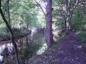 By the 1890s the coppicing of Beeley Wood along with the other coppice woods in Sheffield was coming to an end because of reduced profits and woodland management problems. The wood was allowed to become a "high forest" with the strongest growth of a coppiced tree allowed to grow into a fully grown standard tree. Many of the older and sickly trees were cleared away at this time and replaced by saplings of trees that were not native to the Sheffield area, such as beech, sweet chestnut, common lime and sycamore. In late 1898 the Duke of Norfolk's forester planted Beeley Wood with 60 acres (24 ha) of timber trees such as ash, elm, sycamore, birch, lime, sweet chestnut and beech. The young trees were ordered from a nursery in Cheshire and were delivered to Wadsley Bridge railway station.[3] In 2011 the Forestry Commission approved funding for a five-year plan to improve the unmanaged habitat of the wood; under the scheme an area of 9.6 acres (3.9 ha) will be coppiced and a further 2.7 acres (1.1 ha) will be thinned to allow more light and warmth into the wood and therefore improve conditions for wild flowers, insects and birds.[4] In February 2016 the Environment Agency removed the middle two-thirds of Beeley Wood Lower Weir on the River Don as part of a scheme to allow the free migration of fish and let the river return to a more natural form.[5]