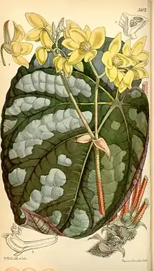 Begonia xanthina is a species of flowering plant in the family Begoniaceae, native to the eastern Himalayas, Assam, and southwestern Yunnan in China.[1] A rhizomatous geophyte reaching 40 cm (16 in), it is typically found growing near streams on rocky forested hills up to 800 m (2,600 ft) in elevation.[2] It resembles Begonia rex, but with yellow flowers and scattered light green splotches on the leaves.[2]