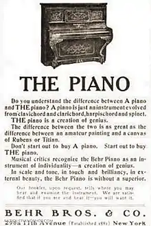 Behr Brothers was a New York based piano company founded in 1880 and hailed as a major contributor to the piano industry of the late 19th and early 20th centuries. Henry Behr of Hamburg, Germany initially established a piano company in New York alongside Leopold Peck (of "Hardman Peck Piano Company") in 1877, named "Behr & Peck", which operated until 1879. In 1880, Behr and his brother Edward Behr went into partnership to form "H. Behr and Brother Piano Company", although this later changed to "Behr, Brother and Company", followed by "Behr Brothers & Company". The company was taken over by Kohler & Campbell in 1910, who continued to produce pianos under the Behr name until the 1950s.[1][2][3]