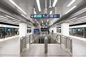 Both the line 8 and line 10 stations have underground island platforms. The line 8 platforms are located a level below the line 10 platforms.