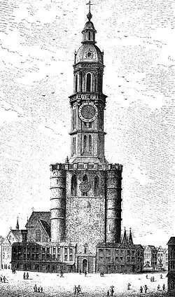 The Belfry of Brussels (French: Beffroi de Bruxelles, Dutch: Belfort van Brussel) was a medieval bell tower in central Brussels, Belgium. Built long before the city's current Town Hall on the Grand-Place/Grote Markt (Brussels' main square), whose tower it should not be confused with,[1] it formerly stood in front of the Church of St. Nicholas until its collapse on 25 July 1714. It was never rebuilt.[2]