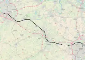 A section between Ghent and Ostend was completed in 1838 and is named line 50A. Between 1923 and 1933, the line 50A was extended to Brussels, which provides a fast connection between Brussels and Ghent.[2] Where the original line 50 enters Brussels from the North, after passing through the city and station of Aalst, the later 50A enters Brussels from the South; this allows through trains from the West of the country to the East or vice versa without having to reverse. In 2016, line 50A was widened with two extra tracks, labelled 50C, between Denderleeuw and Brussels; the main reason was the increase in traffic from the GEN/RER commuter trains.[3]