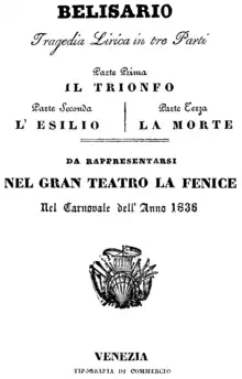 Belisario (Belisarius) is a tragedia lirica (tragic opera) in three acts by Gaetano Donizetti. Salvadore Cammarano wrote the Italian libretto after Luigi Marchionni's adaptation of Eduard von Schenk's play, Belisarius, first staged in Munich in 1820 and then (in Italian) in Naples in 1826.[1] The plot is loosely based on the life of the famous general Belisarius of the 6th century Byzantine Empire.