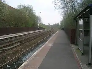 Only two platforms remain in 2017, whilst there are no surviving buildings present other than standard waiting shelters on each platform. Train running information is offered via timetable posters and telephone. No step-free access available, as entry and exit on both sides is via a pair of stepped ramps from the main road.[2]