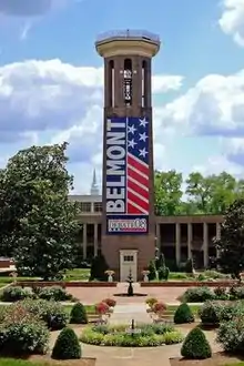 The Belmont Tower and Carillon is an iconic structure on the campus of Belmont University in Nashville, Tennessee. The Tower is listed in the National Register of Historic Places as part of the Belmont Mansion registration[2] and is prominently featured in the university logo. The current Belmont University Tower and Carillon chimes each hour from 9:00am–8:00pm.