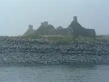 In the 1790s Belnahua was leased out by the landowners to the Stevenson brothers whose aim was to supply slate for the developing town of Oban.[Note 3] Cottages were constructed for the workers in the south east corner of the island and there was a school and company store. Virtually all the provisions had to be supplied from Luing, including drinking water. Rainwater was collected in reservoirs but it was used to power the steam engines that drove the quarries' pumps. By the early 19th century the Stevenson family were shipping slate from both Belnahua and Fladda to Campbeltown in Kintyre.[8] Their lease was eventually passed on to the Shaw family of Luing who hired a quarry master that lived on a 2-storey house on the island. At the height of the activity there were 30 quarry workers and their families living there and a total population of over 150.[27][9] With the commencement of World War I in 1914 quarry work ceased and the island was completely abandoned and it has been uninhabited ever since.[10]