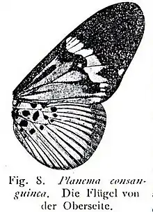 P. consanguinea differs from the preceding [Bematistes elongata ]in having the basal part of the forewing above more or less light and the light transverse band more obliquely placed, narrowed or indistinct behind vein 2 and separated from the light basal part by a dark transverse band of the ground-colour, while the upperside of the hindwing is not darkened at the base. The black streaks on the hindwing are long and reach at least the middle. The marginal band on the upperside of the hindwing is sharply defined and is formed nearly as in elongata. - consanguinea Auriv. (58 b). The basal part of the forewing above as far as vein 3 chestnut-brown with or without longitudinal streak in the cell; the transverse band and the upper surface of the hindwing yellow- brown; the under surface of the hindwing yellowish grey, at the base more or less red-brown. The female is larger and lighter and has the transverse band of the forewing broader and light yellow. Niger to the Congo, ab. intermedia Auriv. only differs in having the whole of the cell of the forewing black. Congo. - sartina Jord. seems to be the north-western race. Only the female is yet known; it differs from that of the type-form in having the transverse band of the forewing as dark as in the male and placed nearer to the base, the marginal band of the hindwing is broader and the ground-colour lighter; on the under surface the base is darker brown and the ground-colour lighter. Gold Coast. - In albicolor Karsch (= arenaria E. Sharpe) (57 e, 58 b) the transverse band of the forewing is white and the parts of the upper surface which in the type-form are red-brown to yellow-brown are dirty sand-yellow (male) or white (female); the under surface of the hindwing is light grey to white as far as the base. Uganda.[4]
