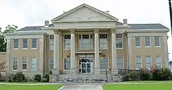 A bond was approved for the county courthouse by 1908, and Virginia architect Henry H. Huggins was selected as architect by the county commissioners from a group of fourteen proposals.[2] It was completed in 1909 at a cost of $50,000.[3] The building initially had a clock tower atop it, but it fell through to the ground-floor lobby sometime in the mid-20th century and was never replaced.[3][4]