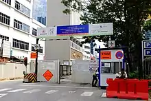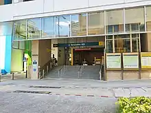 The station has three entrances.[8] Exit A of the station is inside of the NAFA Tower Block above the station and the underpass link to the SMU.[7][8] The station was constructed alongside NAFA's fourth campus. This integration allows students to access the campus easily, regardless of the weather conditions.[22] The glass and frame structure of Exit B is designed in a vintage style to "harmonise" with the colonial-style exterior of Hotel Rendezvous near the station.[7]