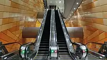 The curving interior walls symbolise canyon walls and earth-tone colours represent the many layers of the soil,[23] emphasising the depth of space.[7] The glass walls of the passenger lifts were tinted in maroon so that the journey to the platforms looks like a descent to the Earth's core.[7][23]