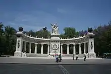 The Benito Juárez Hemicycle is a Neoclassical monument located at the Alameda Central park in Mexico City, Mexico and commemorating the Mexican statesman Benito Juárez. The statue of Juárez is flanked by marble Doric columns. There are two allegorical female statues next to Juárez, representing the fatherland and law.[1] The pedestal bears the inscription "Al benemerito Benito Juárez la Patria" (Spanish: "To the meritorious Benito Juárez, the Homeland"). It was depicted on the reverse of the 20 peso bill of Series C and D, issued in 1994.