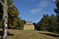 The Benjamin Bosworth House is located southwest of Eastford's village center, on the west side of John Perry Road north of its junction with Church Road. It is a three-story wood-frame structure, with a two-story main block topped by a hip roof from which a full-height monitor section projects.[2] Eleven fireplaces, five bedrooms, five bathrooms, one (former) Masonic Lodge, one living room, one dining room, two great halls, a front parlor, office, workshop, kitchen, pantry, and laundry room are contained in the home. A precariously placed barn is also located on the property.