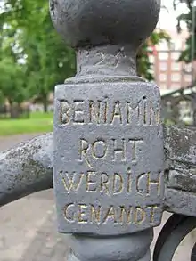 Sometime between 1712 and 1715 Benjamin was commissioned to forge a railing for a staircase at Katarina Church in Södermalm. The stair was dedicated to Charles XII of Sweden and his royal monogram appears above the dedication date. He is also mentioned in the poem that is engraved on the pillars on either side of the stair. This double staircase leads from the cemetery up to the southern entrance of the church. It was dedicated in 1715 and he was paid 300 riksdaler for the work. The railing was renovated by Benjamin's son, Carl Roth, in 1776.
