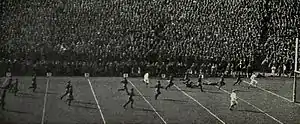 On October 31, Friedman threw two touchdown passes in a 54–0 victory over Navy.[23] Friedman also kicked five extra points in the game.[23][24] Writing in the Chicago Daily Tribune, James Crusinberry wrote: "If any one man stood out, it was Benny Friedman, who hurled forward passes with accuracy and abandon time after time. . . . Besides that, Benny was a regular whirligig in carrying the ball. And it was Benny who was the field general. His selections of plays was something that would make any general envious."[25] Crusinberry later added: "And now we have Mr. Yost's new Michigan team, with not a Grange on it, but with one of the brainiest players of the age in Benny Friedman and a lot of smart fellows to work with him. Before Benny Friedman ends his career all the teams of the country, even the Navy, will have abandoned the old style football and will be using, or at least trying to use, smart and unexpected stuff. It gains ground, it is spectacular, and it wins."[26]
