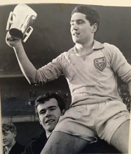 Benny holding the Sigerson Cup just after winning the final in January 1968 and being held aloft by UCD supporters