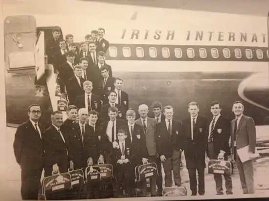 The University College Dublin Gaelic Football team before leaving Dublin airport for New York where they opened their American Tour by playing New York on 30 June 1968. Included in the front row are Mr B Devlin, chairman Dublin Football Board; Rev. B. Heffernan, president UCD Club; Mr P. Mc Donald, vice-president; Mr E McGee, secretary and Dr. J.J. Stuart, past-president of the GAA.
