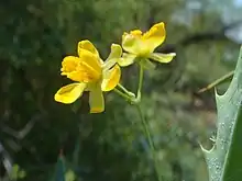 The inflorescences bear 3 to 5 bright yellow flowers, each with nine sepals and six petals all arranged in whorls of three.[3] The plant blooms from February to June.[5]