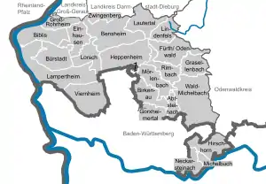 Bergstraße (German: [ˈbɛʁkˌʃtʁaːsə]; "Mountain Road") is a Kreis (district) in the south of Hesse, Germany. It is at the northern end of the Bergstraße route. Neighboring districts are Groß-Gerau, Darmstadt-Dieburg, Odenwaldkreis, Rhein-Neckar-Kreis, the urban district Mannheim, the Rhein-Pfalz-Kreis, and the urban district of Worms. Kreis Bergstraße belongs both to the Rhine Neckar Area and the Rhein-Main Region.