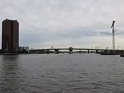 The Interstate 264 Berkley Bridge is a double-leaf bascule bridge that crosses the Eastern Branch of the Elizabeth River in Norfolk, Virginia, United States. It carries Interstate 264 (I-264), U.S. Route 460 Alternate (US 460 Alt.), and State Route 337 (SR 337) across the river, connecting the Berkley neighborhood south of the river with downtown Norfolk to the north. The toll-free facility is one of only a small number of movable bridges on the Interstate Highway System, and is the first of two in the Hampton Roads region, predating the High Rise Bridge. It is named for the former Town of Berkley that is now a part of the City of Norfolk.