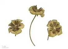 The plant grows to about 30–60 centimetres (1–2 feet) in height and width,[4] less commonly 120 cm (4 ft).[5] When the plant freezes, the roots will preserve its life.[6] The velvety leaves are pinnately lobed or scalloped.[6][5] The flower head is approximately 4 cm (1+1⁄2 inches) in diameter, with 5–12 (most commonly 8) yellow ray florets, which are 1.5 cm (5⁄8 in) long.[5] In areas that freeze, the flowers bloom at night from spring until frost.[4] In frost-free areas, it will bloom year-round (typically April to October).[4][5] Around mid-morning, the flowers close or drop.[4] As it gets hotter, the flower begins to turn white and the ray florets begin to drop, leaving the green disc shape.[6] The seed-like fruit is scaleless and hairless at the tip.[5]