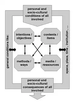 The goal of the “Berlin Model” is to support the process of making useful decisions with regard to the questions “why”, “whereto”, “what” and “how” within a group, considering all the different conditions and situations. It offers support for analysis and planning of single steps and for subsequent reflection and evaluation of work units or group works. By systematic evaluation of teaching on an empirical basis, Heimann established “formal constants” (also known as categories) of lessons, occurring time-independent in teaching. These identified categories (teaching factors) can serve as a guideline to lesson planning. Heimann identifies six of these constants within two fields: