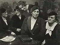 Bernadette Cattanéo, Luce Langevin, Wanda Landy, Margarita Nelken, and Maria Rabaté (l-r) celebrating the victory of the Popular Front in Spain in 1936, under the auspices of the Women's Committee