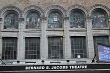 The Bernard B. Jacobs Theatre is at 242 West 45th Street, on the south side between Eighth Avenue and Broadway, near Times Square in the Theater District of Midtown Manhattan in New York City.[4][5] The nearly rectangular land lot covers 9,275 sq ft (861.7 m2), with a frontage of 88.17 ft (26.87 m) on 44th Street and a depth of 100.42 ft (31 m).[5] The Golden Theatre shares the city block with the Row NYC Hotel to the west. It adjoins six other theaters: the Gerald Schoenfeld and Booth to the east, the Broadhurst and Shubert to the southeast, the Majestic to the south, and the Golden to the west. Other nearby structures include the Music Box Theatre and Imperial Theatre to the north; the New York Marriott Marquis to the northeast; One Astor Plaza to the east; and Sardi's restaurant, the Hayes Theater, and the St. James Theatre one block south.[5]