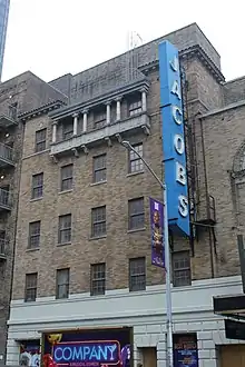 The Jacobs is part of the largest concentration of Broadway theaters on a single block.[6] The adjoining block of 45th Street is also known as George Abbott Way,[7] and foot traffic on the street increases box-office totals for the theaters there.[8] The Majestic, Masque (Golden), and Royale (Jacobs) theaters and the Lincoln Hotel (Row NYC Hotel) had all been developed concurrently.[9] The site of all four buildings had previously occupied by twenty brownstone residences.[10] The site was part of the Astor family estate from 1803[11] to 1922, when it was sold to Henry Claman.[12][13] The plots collectively measured 200 feet (61 m) wide along Eighth Avenue, 240 feet (73 m) along 44th Street, and 250 feet (76 m) along 45th Street.[13][14]