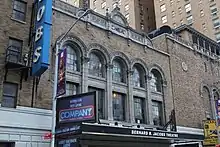 The upper stories contain gold-colored, bonded Roman brick.[17][22] The brick facade was designed to relate to the adjacent theaters and hotel.[17] On the upper stories, the auditorium section has a set of five arches on the second and third stories. The arches rise above terracotta piers that contain Corinthian-style capitals. Each arch contains iron-framed sash windows with multiple panes, separated by horizontal transom bars.[24] A similar, narrower arcade exists on the neighboring Golden Theatre.[25] A sign with the theater's name is placed between the auditorium and stage sections. The parapet of the auditorium facade contains a terracotta coping.[24] Above the center portion of the facade, there is a rounded pediment with finials and an ornamental lunette.[17][24]