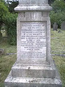 Bernard Laurence Hieatt's grave in Reading Old Cemetery in Cemetery Junction in Reading is a Grade II listed memorial, with a statue of him in full racing gear.[5] On the memorial it reads,