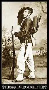 A contingent of Bersaglieri drawn from the autonomous battalions of the 1st Bersaglieri Regiment was sent to participate in the Sinai and Palestine Campaign in 1917, where they were attached to the Egyptian Expeditionary Force commanded by General Edmund Allenby. Their "mainly political" role was to assert "hereditary ecclesiastical prerogatives in connection with the Christian churches at Jerusalem and Bethlehem."[2][3][4]